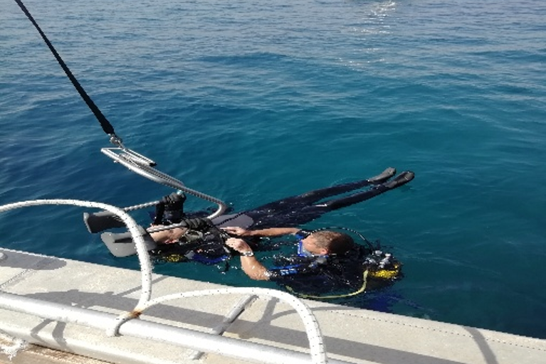 Habitant en bord de mer, je vais souvent me baigner et j'avais repéré ce bateau d’une école de plongée avec un système permettant la mise à l'eau des personnes handicapées, je pensais qu'avec cette aide je pourrais peut-être enfin replonger… Je prenais donc contact avec la Commission Handisub (commission handicap de la plongée) de mon département et j'étais immédiatement rappelé par son représentant qui m'indiquait bien qu'il n'y avait pas de problème, que cette école de plongée avait l'habitude des personnes handicapées et que je pouvais y aller sans souci.