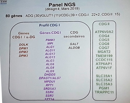 Les autres présentations ont porté notamment sur les réseaux européens de recherche (MetabERN et EuroGlycan) et les actions, sur les stratégies de diagnostiques (test de transferrine, séquençage haut débit) ainsi que sur une proposition de guidelines ovaires et CDG1a.