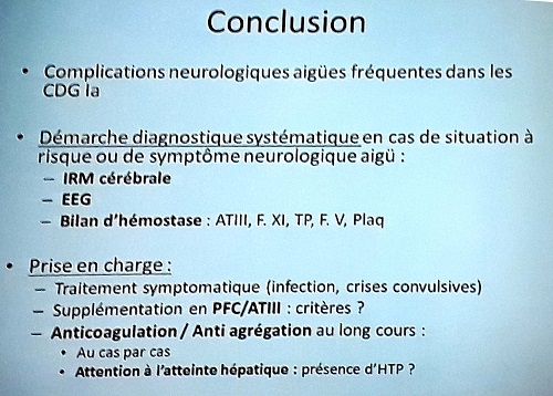 Un rappel des caractéristiques de la maladie a été fait, en particulier sur le CDG1a (PMM2) qui représente près de 80% des cas observés soit plus d’une centaine de familles. Cette forme entraîne des retards psychomoteurs, des problèmes neuropathiques et certains font des accidents aigus neurologiques (Stroke-Like, Thrombose).
