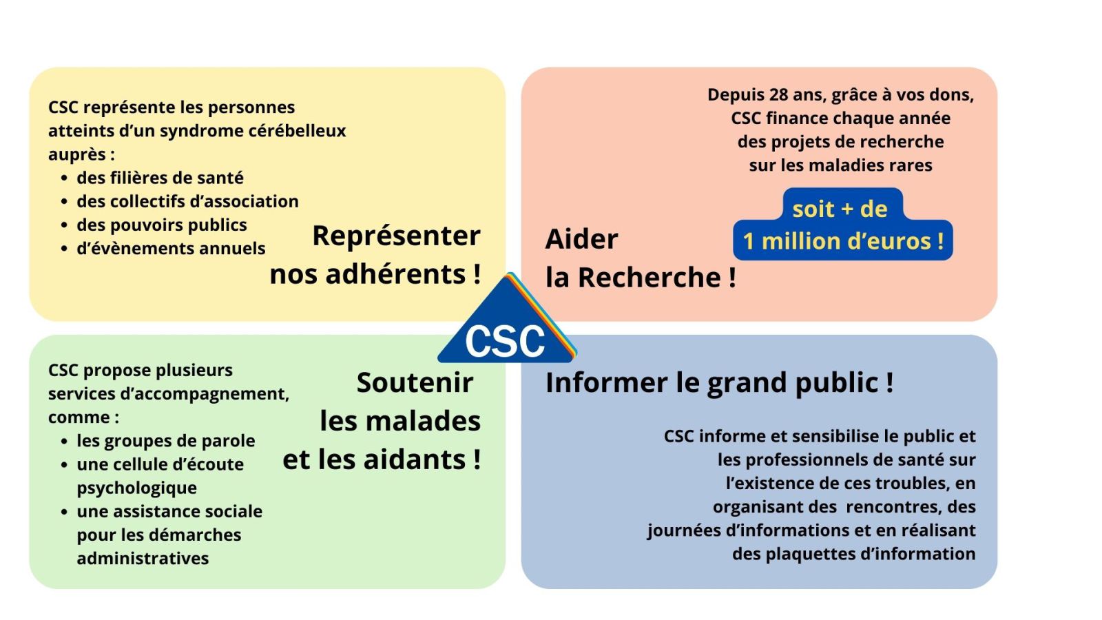 Connaître les Syndromes Cérébelleux (CSC) est une association de patients créée en 1995 sur 4 fondements, 4 axes qui nous motivent tous les jours, 4 missions complémentaires ayant toutes la même importance.