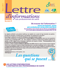 Cette fiche dresse l’état des lieux de ces sources d’informations : Créé en 2005 et présidé par le Dr Alexandra Dürr, le Conseil Médical et Paramédical, commun aux trois associations concernées par ces pathologies (AFAF - CSC - ASL), comprend 17 soignants en contact avec les patients touchés par ces maladies. Le CMP a rédigé 9 lettres d’information à destination des soignants, intitulées : “Recommandations à dire d’experts dans les affections spinocérébelleuses”.