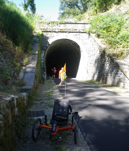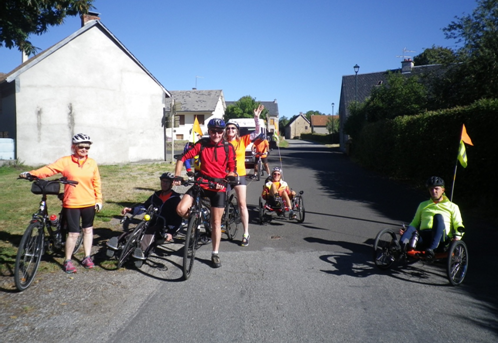 Comme en 2015 pour le parcours de la Via Rhôna, c’est l’association de Montbrison (42) « courir pour guérir » qui organisait ce défi : 3 tandems, 2 trikes (ou tricycle), 1 handbike, 1 vélo à assistance électrique, 2 vélos solo « suiveurs » et 6 chauffeurs (3 camions et 1 voiture) !! 18 personnes (7 handicapés et 11 valides) en tout et un sacré peloton sur la route, Bravo à eux !
